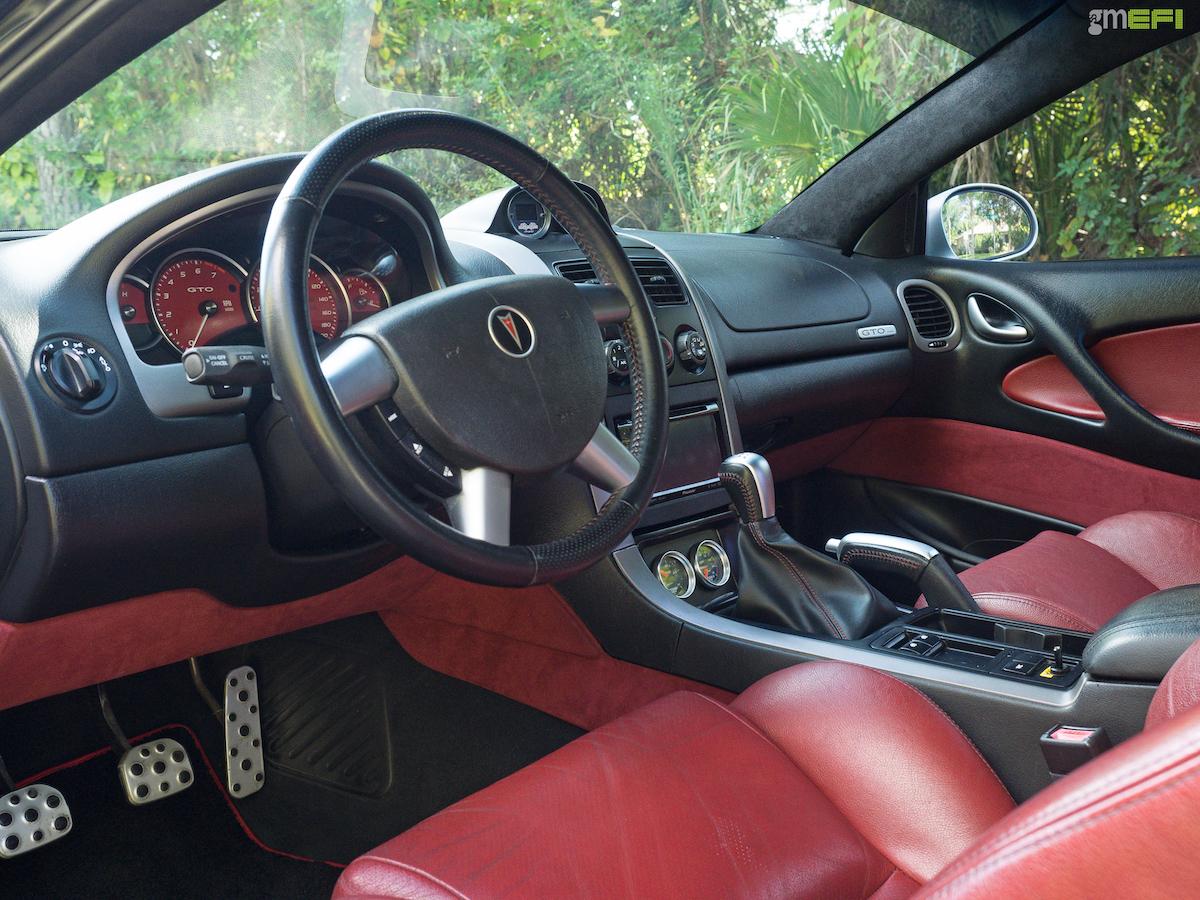 It still maintains its OEM sway bars, and upper and lower control arms all the way ar0und! However, DBA slotted rotors sit inside the calipers, and Joe had the factory ’05-06 18-inch GTO wheels powder coated black, and wrapped in Nitto NT555 rubber all the way around. They measure in at 235/40 in the front and 275/35 out back.
