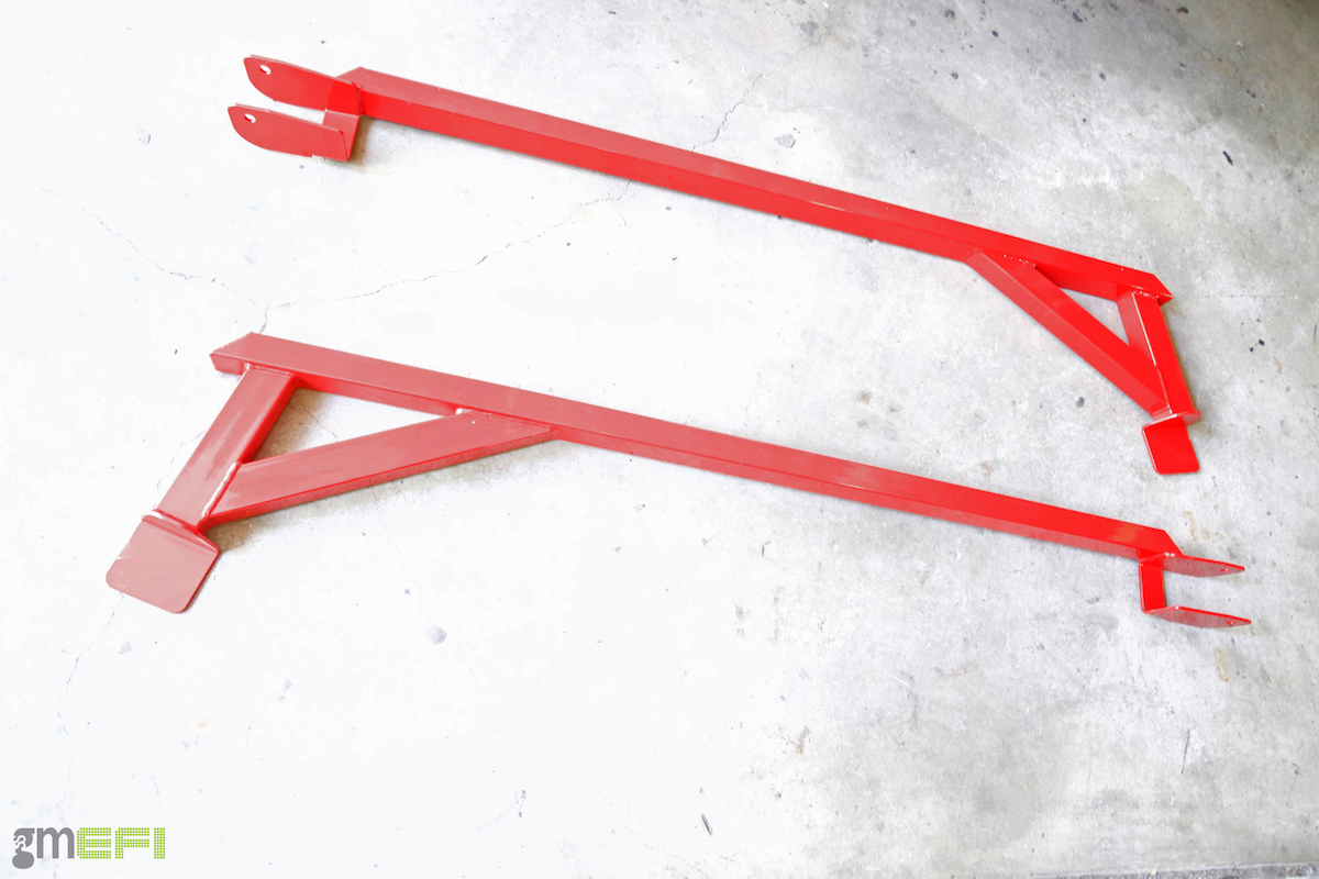 The BMR K-member and front lower control arms (PN-AA008) pictured with the subframe connectors and chassis brace that you’ll read about below). The K-member (bottom row, center PN-KM008) is a tubular piece that increases strength and rigidity, drops weight and allows more room for your hands when you wrench on the car. Since ours is intended for LS-swapped third-gen cars, they arrived to our shop with LS motor mounts already in place. When combined with the tubular lower A-arms, a weight reduction can be seen over that of the stock K-member and lower A-arms.