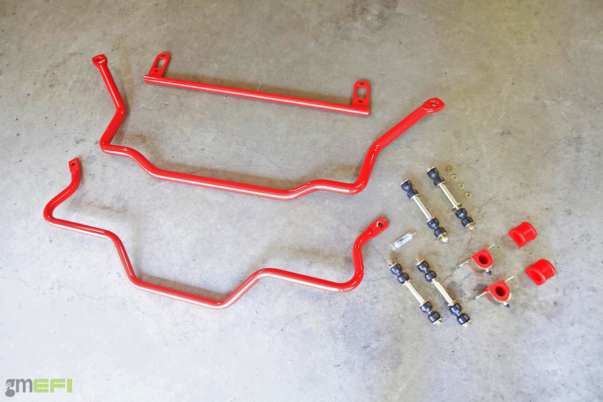 Project Redrum gets new sway bars, as well as BMR’s front chassis brace (PN-CB002) for added rigidity. Along with the subframe connectors are polyurethane end links and sway bar bushings, utilizing technology from Energy Suspension. The sway bar kit is (PN-SB027), and it comes with everything you see here, minus the chassis brace. They spec in at 32mm solid (front), and 25mm hollow in the rear. In a car aimed at cornering, the BMR sway bars help control body roll, and keep the car stable through the corners. The aforementioned chassis brace is a simple bolt-in, that utilizes the same morning locations as the front sway bar bushings, and helps provide a tighter steering fell, as well as increases sway bar effectiveness and chassis stiffness.